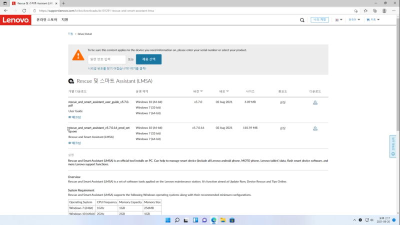 그렇다면, 레노버 홈페이지에 있는 Rescue 및 스마트 Assistant (한글 영어 둘중 하나만 고르지를..)가 있습니다. 설치를 진행해주시고요,