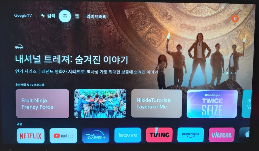 다만 한가지 아쉬운 점은, 저는 넷플릭스 계정만을 연결해놓았지만, 홈 화면에 나오는 추천 컨텐츠는 보통 디즈니플러스나 웨이브 영상이 대다수여서 사실상 보지 못하는 영상들입니다. 사용자가 연결한 계정에 따라 저 같은 경우에는 넷플릭스의 영상만 뜨면 좋을 것 같은데,, 이렇게 홈 화면에 큼지막하게 나온다는 것은...