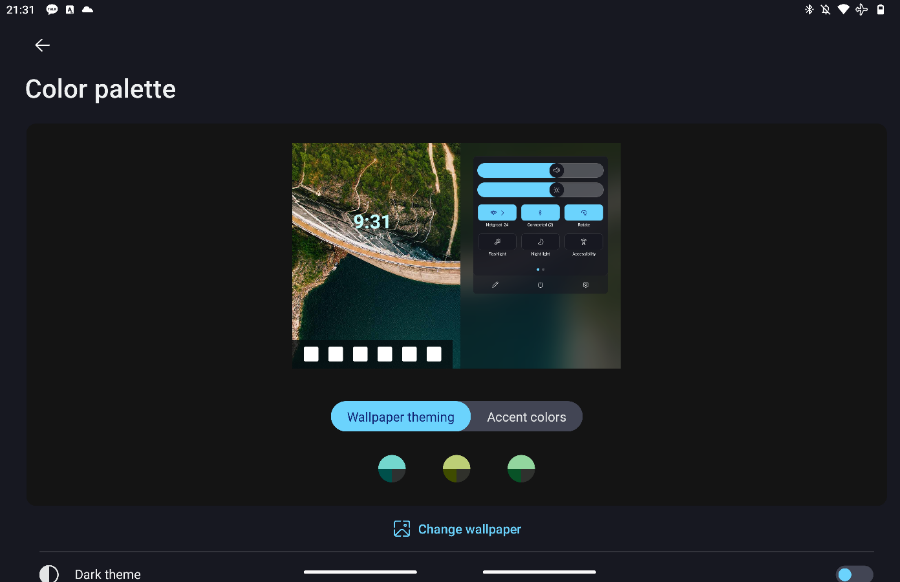 예상했던데로 Material You의 배경화면에 맞춰 테마 색을 바꿔주는 컬러 팔레트 기능이 들어갔습니다.