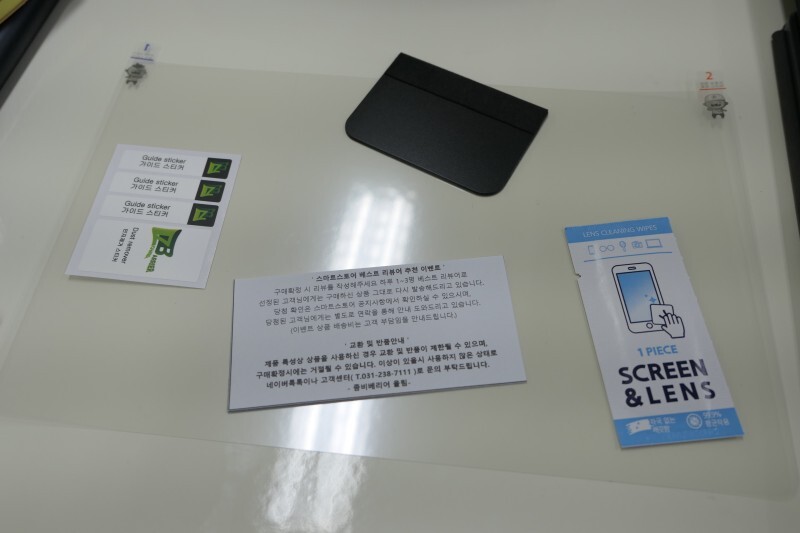 이렇게 보호필름과 알코올솜, 기포제거를 도와주는 카드? 같은것과 먼지제거 스티거가 들어있습니다.